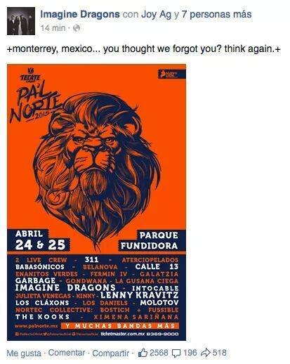 Con la leyenda “monterrey, mexico…you thought we forgot you? Think again.” (“Monterrey, México…creen que nos olvidamos de ustedes?”), la banda estadounidense Imagine Dragons rompió el secreto sobre el cartel del Pa’l Norte 2015, al publicar dicho line up en sus redes sociales.