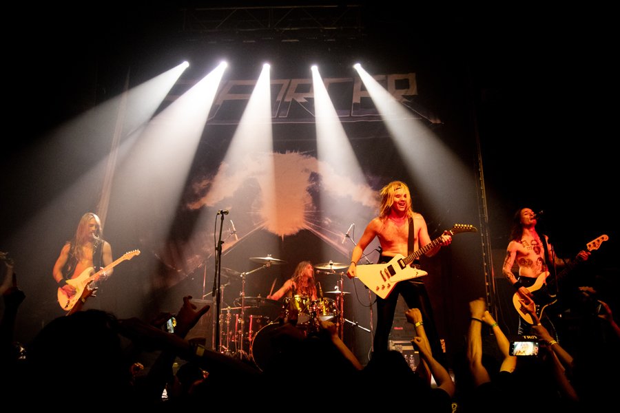 Posteriormente, poco después de las 23:00 horas tocó el turno a Enforcer, banda sueca que mezcla elementos de glam y metal, cuya última visita se dio el 23 de febrero del 2016 precisamente a un lado del Musicantro, en La Tumba.