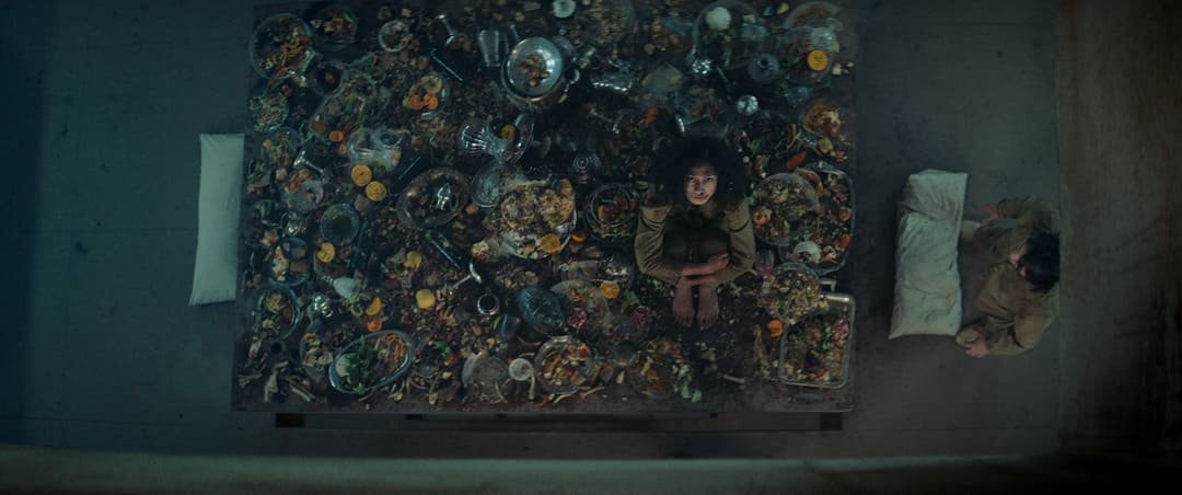 El problema central es la comida, ya que “La Administración” diariamente coloca un gran banquete para los reclusos, el cual baja mediante una plataforma por cada nivel.