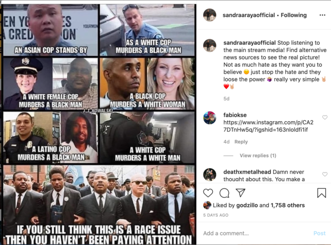 Y es que Sandra Araya ha hecho varias publicaciones polémicas en su cuenta de Instagram, en las que se ha manifestado en contra del movimiento, incluso en algunas se percibe un claro enfoque racista.