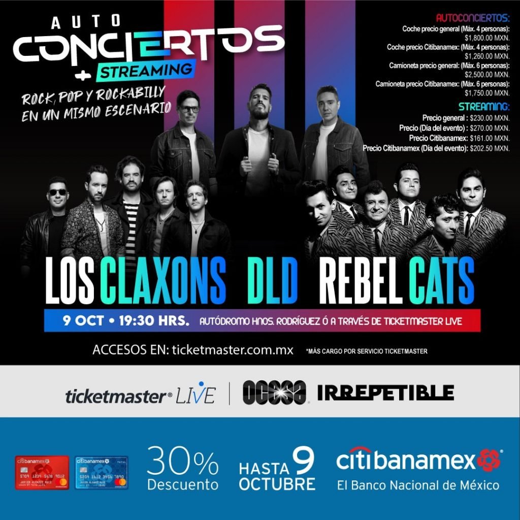 Pues ya lo sabes, este 9 de octubre se realizará el autoconcierto “Irrepetible” de Rebel Cats, DLD y Los Claxons en el Autódromo Hermanos Rodríguez y se transmitirá vía streaming. Para mayor información dale click AQUÍ.