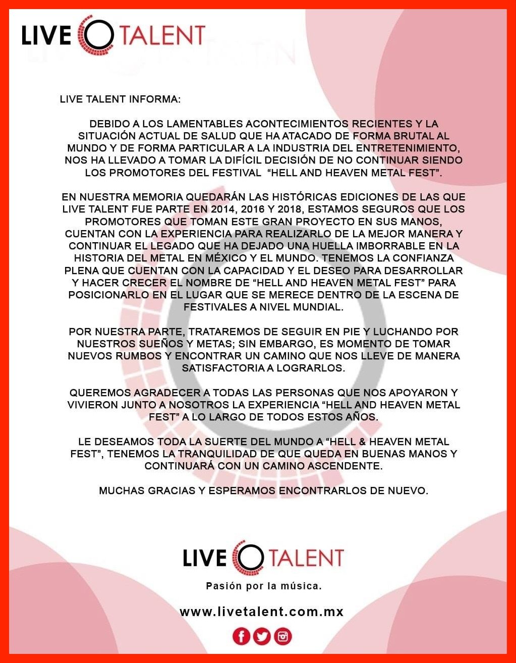 “Debido a lamentables acontecimientos recientes y la situación actual que ha atacado de forma brutal al mundo y de forma particular a la industria del entretenimiento, nos ha llevado a tomar la difícil decisión de no renovar nuestra relación como promotor de la marca Hell and Heaven Metal Fest”, se lee en el comunicado.