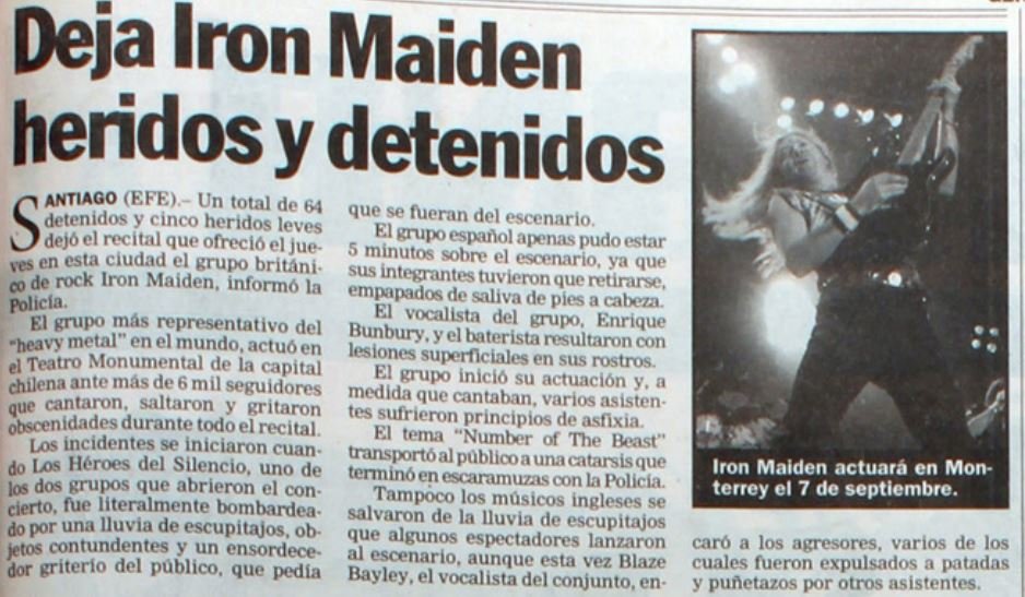 Pero la fanticada chilena quedó tan prendida y tan fúrica que también lanzaron una lluvia de escupidas a los miembros de Iron Maiden, sobre todo a Blaze Bayley.